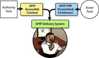 Figure 1 illustrates the basic idea of APIP. Authors create content, providing extra information when needed to make that content accessible to all students. An assessment rostering system can provide the specific needs of individual students; these are documented in the PNP profile. An APIP certified delivery system takes the needs of a specific student, and ensures that the content is provided to the student with all their needed access supports.
