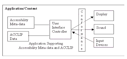 An Intra-Application Conformance document for Behaviors within Applications supporting both ACCLIP and Learning Object accessibility meta-data. This document will describe the behavior of an application that provides a user interface to the user based on the presence of both ACCLIP and accessibility meta-data. For example, if a user is hearing-impaired and caption text is available for a video resource, then the application must display the caption text. See Figure 4.2.