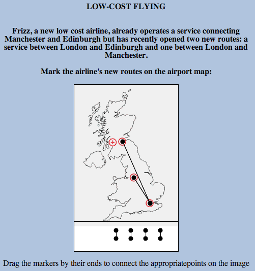 This example illustrates the gapMatchInteraction. This interaction is similar to matchInteraction except that the choices in the second set are gaps in a given passage of text and the task involves selecting choices from the first set and using them to fill the gaps. The same attributes are involved in controlling which, and how many, pairings are allowed though there is no matchMax for the gaps because they can only ever have one associated choice. The scoring is again done with a mapping.