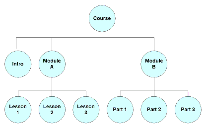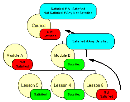 In Figure 7.2, lessons 5 and 4 have been satisfied, but lesson 6 has not. Module B has a rollup rule that indicates if any lesson in it is satisfied, then the module is satisfied. Similarly, the course has a rule that says all modules must be satisfied and the course is not satisfied until all modules are.