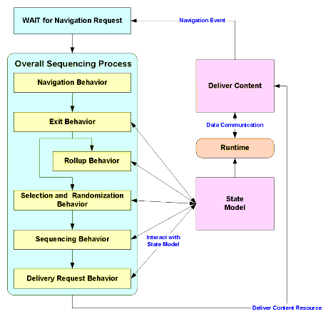 The system waits for a navigation event, which is translated into a navigation request and passed to the Overall Sequencing Process. This process acts as the process control by invoking various sequencing processes. Navigation Behavior acts on the Navigation Request and results in Exit and Sequencing Requests. Exit Behavior acts on any pending Exit Request and results in a Sequencing Request. Sequencing Behavior acts on any pending Sequencing Request and may result in a Delivery Request. Delivery Behavior acts on any pending Delivery Request and may result in the delivery of some activity to the learner. More detail follows.