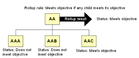 The Rollup Rules process causes information to be percolated up the activity tree from lower levels. A parent activity's objective and progress status are determined by its children. Rollup Rules can be applied to a parent activity that determines the conditions for objective and progress status are: Satisfied, Not Satisfied, Completed, or Incomplete.