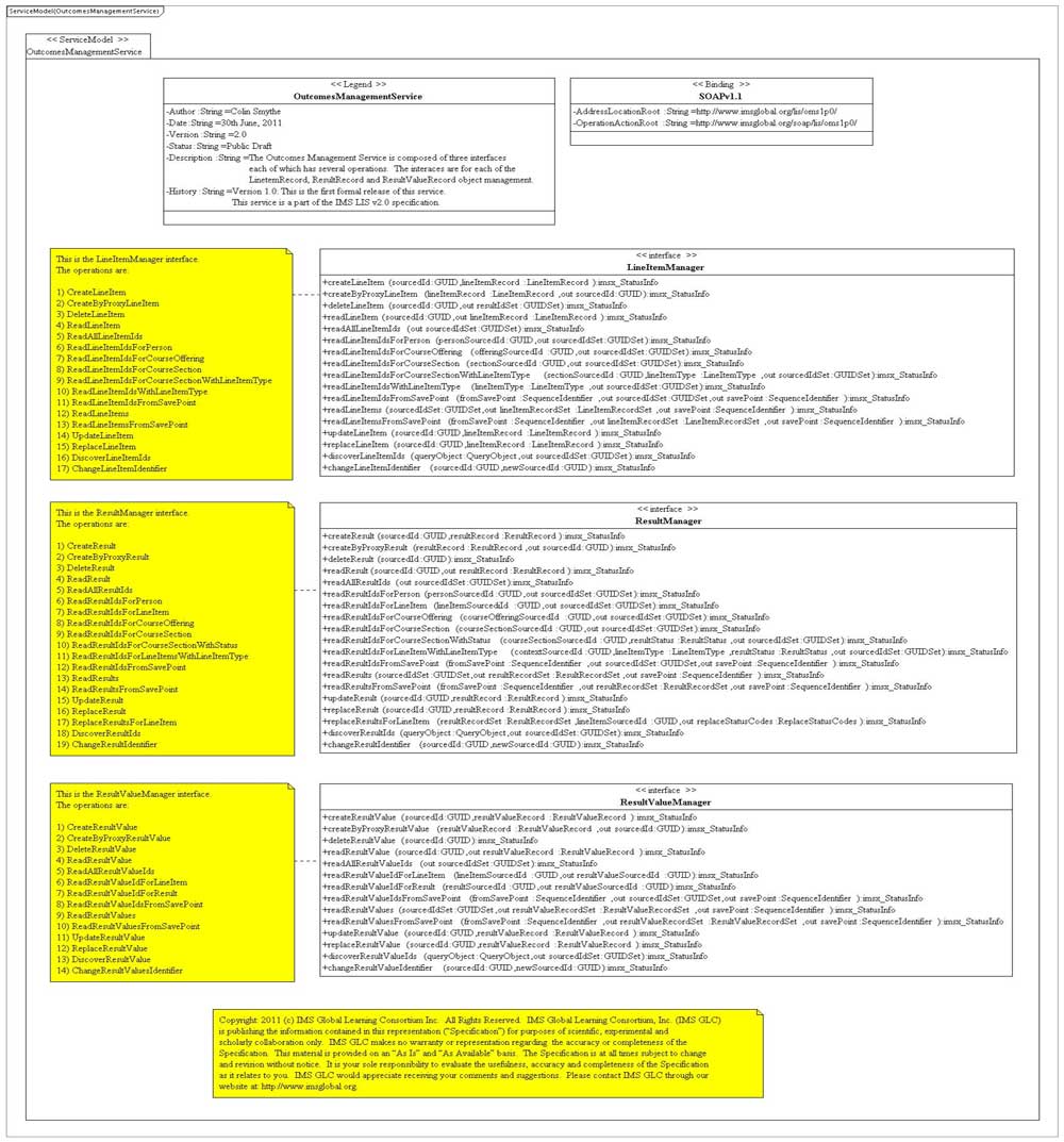 This document contains the description of the 1EdTech GLC Outcomes Management Service v1.0 WSDL/XSD binding. This service is used to exchange information about reporting Outcomes. An Outcome consists of LineItems, Results and ResultValues. The business transactions include the simple create, read, update and delete of the Outcomes data models for a single instance. This document contains the definition of the corresponding Web Service based upon SOAP/HTTP messaging. |