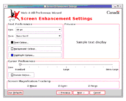 For privacy and security reasons, best practice use of the accessibility preferences will not have the preferences being stored with or associated with the identity of the user claiming those preferences. An independent wizard that allows for users to instantaneously vary preferences may be required.