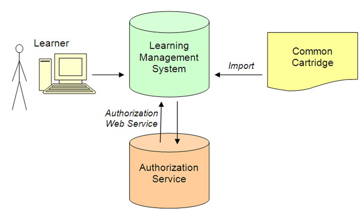 A common cartridge will include the information required for the LMS to communicate with an authorization service provided by the cartridge publisher. When a user attempts to access or import protected cartridge content, the LMS will prompt the user for an access code. The LMS will then use the service to send to the cartridge publisher the access code and some unique identifier for the cartridge being accessed. The cartridge publisher's system will attempt to validate the provided information. If the information is valid the service will respond with a success code and optionally an expiration date after which access by the user should once again require contacting the service. If the information is deemed invalid, an error code is returned along with a human-readable description of why the credentials were rejected.