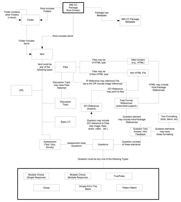 Common Cartridge focuses primarily on how information should be physically arranged in a package and how learning platforms should construct specific native objects such as external links, discussion topics, BLTI links, assessments, and question banks. Common Cartridge also specifies how conforming learning platforms must behave when processing packages.