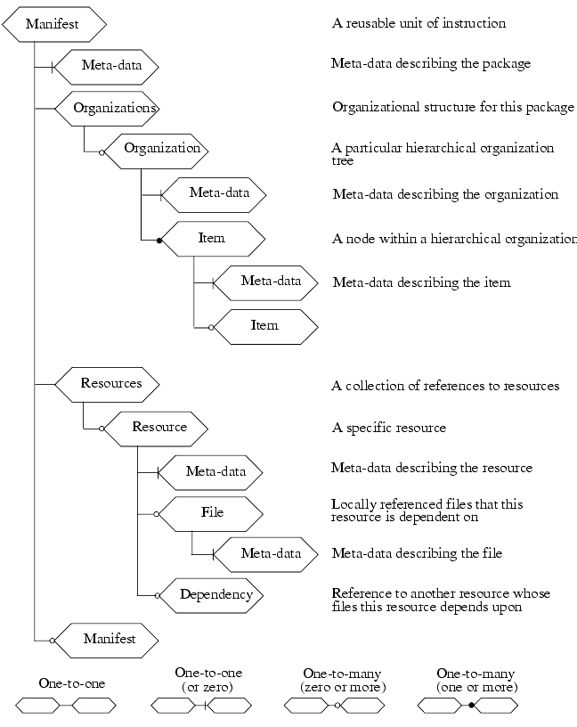 Manifest - A manifest is a description in XML of the resources comprising meaningful instruction. A manifest may also contain zero or more static ways of organizing the instructional resources for presentation.