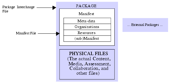 Packages are not required to be incorporated into a Package Interchange File. A Package may also be distributed on a CD-ROM or other removable media without being compressed into a single file. An 1EdTech Manifest file and any other supporting XML files required by it (DTD, XSD) must be at the root of the distribution medium.