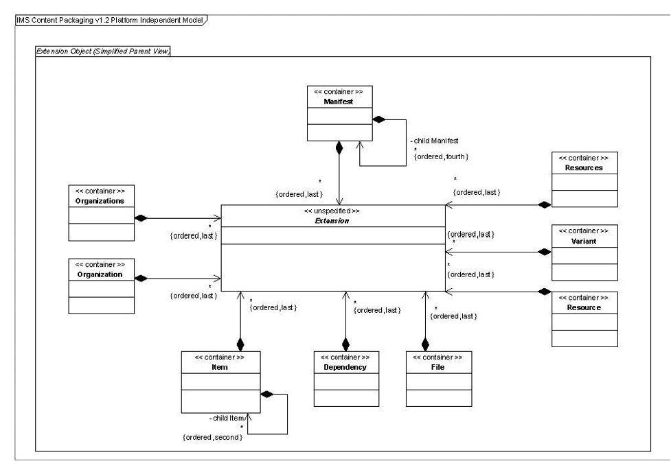 This section defines the Extension class placeholder that is part of the 1EdTech Content Packaging Information Model. Figure 6.8 shows the Extension class PIM.