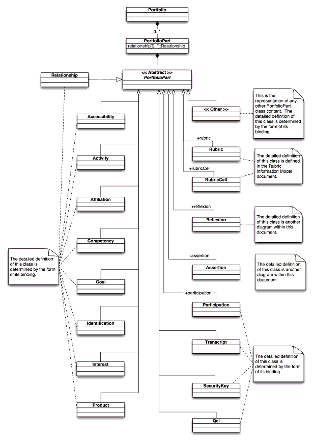 This expanded version of the NLII definition describes the most complicated and sophisticated structure of ePortfolios found in practice. In many concrete applications, certain elements may be unnecessary. Many ePortfolios contain only a single view. Some ePortfolios contain only parts owned and authored by their subject. Some ePortfolios contain no reflections, while others contain no assessment information. Some contain information about how to render their contents, while some do not. This specification provides the means to represent both complex and simple ePortfolio types.
