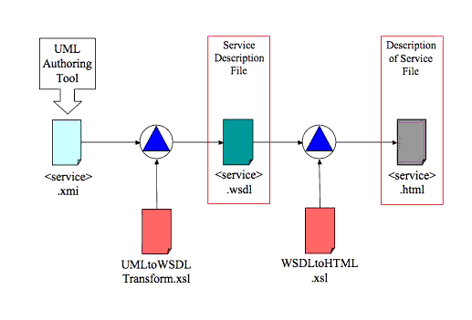 The XMI file is now used as input to the I-BAT. The XSL file 'UMLtoWSDLTransform.xsl' is applied to the XMI file, using an appropriate XSLT tool (Oxygen is the tool recommended by 1EdTech/GLC) to generate the WSDL files. The XSL files automatically create the full set of WSDL files using a predetermined naming convention for the corresponding directory structure, the name(s) of the services and the communications model. The generation process also creates a validation report text file that can be used to identify any problems that the I-BAT found while creating the binding files. The XSL 'WSDLtoHTML.xsl' is used to generate a HTML document that contains the description of the services defined by the WSDL.