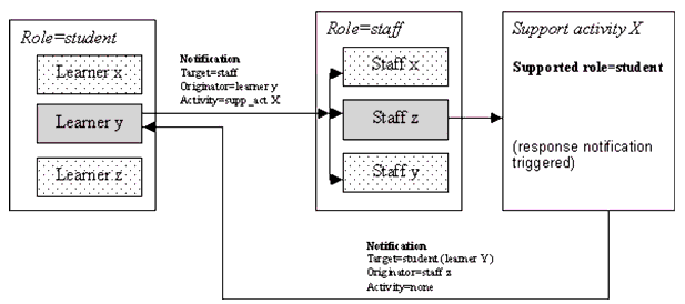 A learning design document uses several roles. For each run, users (staff and learner) can be assigned to the roles defined in learning design.