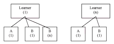 Alternatively, SS may be included in an LD instance document. There are two positions at which SS may be slotted in: inside the environments elements, at the level of the environment element, and within the learning object element at the level of the item element. In the latter case, SS is used to sequence items (and items within it, etc.) that are contained within a learning object. This is very much in the spirit of the SS Specification (although we feel the term 'activity' for what really is a piece of static content is a misnomer). In the former case, SS is used to sequence learning objects and items contained in the learning objects. In both cases, the runtime engine has to be able to process both LD and SS instance documents. Note that even though the SS engine may keep track of whether a user has accessed or somehow completed particular learning objects or items, this information need not influence his or her status with respect to the completion of activities, activity structures, etc. in LD. Typically, activities, etc. can be completed in LD, whereas environments and learning objects are merely accessed, or not, as the case may be.