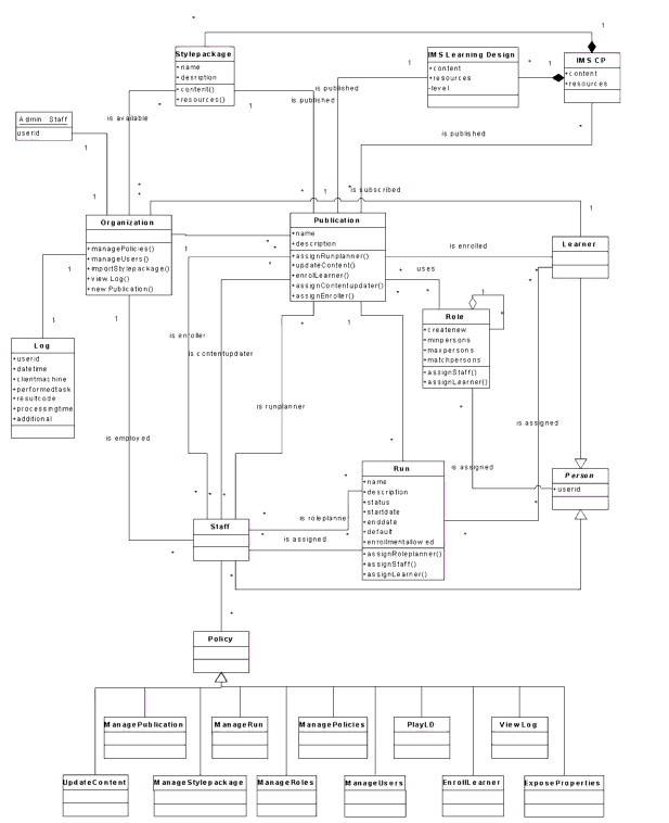 The root class in this diagram is the organization. All other classes are in some form related to this class (directly or indirectly). For an organization a publication may be created by publishing 1EdTech Learning Design (encapsulated in an 1EdTech CP) with all its content using a particular Style package.