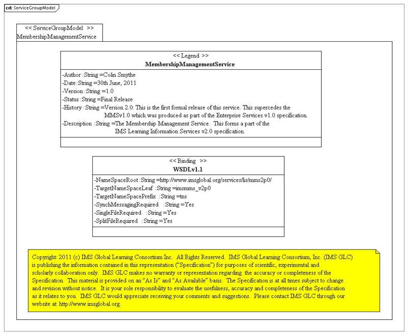 This document is a part of the 1EdTech Membership Management Service (MMS) v2.0 specification. The binding details how the Membership Management Service Information Model is realised as a Web Service; in the form of a Web Services Description Language (WSDL) file. The MMS binding is contained in a set of WSDL, XSD and vocabulary files. The vocabulary files are instances of the 1EdTech Vocabulary Definition Exchange specification [VDEX, 04a], [VDEX, 04b]. The 1EdTech Learning Information Services (LIS) Best Practice and Implementation Guide [LIS, 13b] provides non-normative guidance on how to use the Binding and Information Model. For a conceptual overview of the LIS Specification, please see the overall services description [LIS, 13a]. For a discussion of potential applications, see the Best Practice Guide.