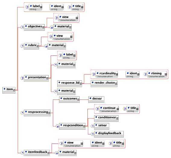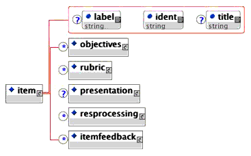 Description: The Item is the only data object that can be exchanged using the QTILite specification (cf. Assessments, Sections and Items in the full specification). Each Item consists of five distinct parts, namely: objectives - the materials used to describe the objectives with respect to each view; rubric - the materials used to define the context of the Item and available for each view; presentation - the instructions describing the nature of the question to be asked; resprocessing - the instructions to be followed when analyzing the responses to create a corresponding score and feedback; itemfeedback - the materials to be presented as feedback to the entered response.