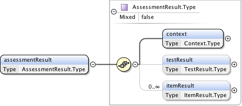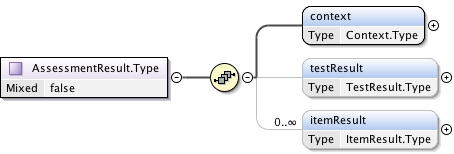 <xs:complexType name="AssessmentResult.Type" mixed="false"><xs:annotation><xs:documentation source="umldocumentation">This is the container for the set of results that can be reported using the QTI data structures. A result instance can contain information about a single AssessmentTest and one or more AssessmentItems.</xs:documentation></xs:annotation><xs:sequence><xs:element name="context" type="Context.Type" minOccurs="1" maxOccurs="1"/><xs:element name="testResult" type="TestResult.Type" minOccurs="0" maxOccurs="1"/><xs:element name="itemResult" type="ItemResult.Type" minOccurs="0" maxOccurs="unbounded"/></xs:sequence></xs:complexType>