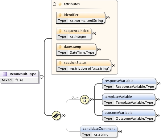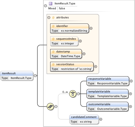 <xs:complexType name="ItemResult.Type" mixed="false"><xs:annotation><xs:documentation source="umldocumentation">This is the container for the results for an AssessmentItem. The result report consists of the information for the associated set of response varables, template variables and outcome variables. Any associated candidate comments are also stored. The report is date stamped.</xs:documentation></xs:annotation><xs:sequence><xs:choice minOccurs="0" maxOccurs="unbounded"><xs:element name="responseVariable" type="ResponseVariable.Type" minOccurs="1" maxOccurs="1"/><xs:element name="templateVariable" type="TemplateVariable.Type" minOccurs="1" maxOccurs="1"/><xs:element name="outcomeVariable" type="OutcomeVariable.Type" minOccurs="1" maxOccurs="1"/></xs:choice><xs:element name="candidateComment" type="xs:string" minOccurs="0" maxOccurs="1"/></xs:sequence><xs:attribute name="identifier" use="required" type="xs:normalizedString"/><xs:attribute name="sequenceIndex" use="optional" type="xs:integer"/><xs:attribute name="datestamp" use="required" type="DateTime.Type"/><xs:attribute name="sessionStatus" use="required"><xs:simpleType><xs:restriction base="xs:string"><xs:enumeration value="final"/><xs:enumeration value="initial"/><xs:enumeration value="pendingResponseProcessing"/><xs:enumeration value="pendingSubmission"/></xs:restriction></xs:simpleType></xs:attribute></xs:complexType>