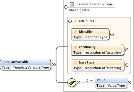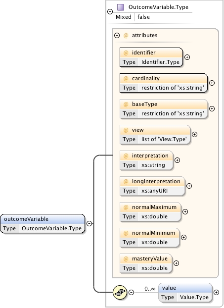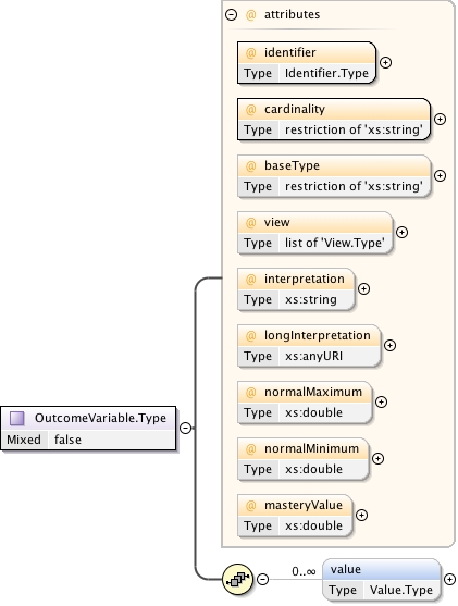 <xs:complexType name="OutcomeVariable.Type" mixed="false"><xs:annotation><xs:documentation source="umldocumentation">The OutcomeVariable complexType is the container for the definition of an outcome variable. Outcome variables are declared by outcome declarations. Their value is set either from a default given in the declaration itself or by a responseRule during responseProcessing.Items that declare a numeric outcome variable representing the candidate's overall performance on the item should use the outcome name 'SCORE' for the variable.Items that declare a maximum score (in multiple response choice interactions, for example) can do so by declaring the 'MAXSCORE' variable.Items or tests that want to make the fact that the candidate scored above a predefined treshold available as a variable can use the 'PASSED' variable.</xs:documentation></xs:annotation><xs:sequence><xs:element name="value" type="Value.Type" minOccurs="0" maxOccurs="unbounded"/></xs:sequence><xs:attribute name="identifier" use="required" type="Identifier.Type"/><xs:attribute name="cardinality" use="required"><xs:simpleType><xs:restriction base="xs:string"><xs:enumeration value="multiple"/><xs:enumeration value="ordered"/><xs:enumeration value="record"/><xs:enumeration value="single"/></xs:restriction></xs:simpleType></xs:attribute><xs:attribute name="baseType" use="optional"><xs:simpleType><xs:restriction base="xs:string"><xs:enumeration value="boolean"/><xs:enumeration value="directedPair"/><xs:enumeration value="duration"/><xs:enumeration value="file"/><xs:enumeration value="float"/><xs:enumeration value="identifier"/><xs:enumeration value="integer"/><xs:enumeration value="pair"/><xs:enumeration value="point"/><xs:enumeration value="string"/><xs:enumeration value="uri"/></xs:restriction></xs:simpleType></xs:attribute><xs:attribute name="view" use="optional"><xs:simpleType><xs:list itemType="View.Type"/></xs:simpleType></xs:attribute><xs:attribute name="interpretation" use="optional" type="xs:string"/><xs:attribute name="longInterpretation" use="optional" type="xs:anyURI"/><xs:attribute name="normalMaximum" use="optional" type="xs:double"/><xs:attribute name="normalMinimum" use="optional" type="xs:double"/><xs:attribute name="masteryValue" use="optional" type="xs:double"/></xs:complexType>