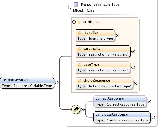 <xs:complexType name="ResponseVariable.Type" mixed="false"><xs:annotation><xs:documentation source="umldocumentation">The ResponseVariable complexType is the container for the definition of a response variable. Response variables are declared by response declarations and bound to interactions in the itemBody. Each response variable declared may be bound to one and only one interaction.</xs:documentation></xs:annotation><xs:sequence><xs:element name="correctResponse" type="CorrectResponse.Type" minOccurs="0" maxOccurs="1"/><xs:element name="candidateResponse" type="CandidateResponse.Type" minOccurs="1" maxOccurs="1"/></xs:sequence><xs:attribute name="identifier" use="required" type="Identifier.Type"/><xs:attribute name="cardinality" use="required"><xs:simpleType><xs:restriction base="xs:string"><xs:enumeration value="multiple"/><xs:enumeration value="ordered"/><xs:enumeration value="record"/><xs:enumeration value="single"/></xs:restriction></xs:simpleType></xs:attribute><xs:attribute name="baseType" use="optional"><xs:simpleType><xs:restriction base="xs:string"><xs:enumeration value="boolean"/><xs:enumeration value="directedPair"/><xs:enumeration value="duration"/><xs:enumeration value="file"/><xs:enumeration value="float"/><xs:enumeration value="identifier"/><xs:enumeration value="integer"/><xs:enumeration value="pair"/><xs:enumeration value="point"/><xs:enumeration value="string"/><xs:enumeration value="uri"/></xs:restriction></xs:simpleType></xs:attribute><xs:attribute name="choiceSequence" use="optional"><xs:simpleType><xs:list itemType="IdentifierList.Type"/></xs:simpleType></xs:attribute></xs:complexType>
