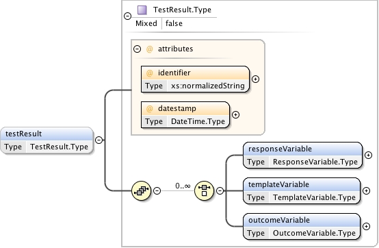 <xs:complexType name="TestResult.Type" mixed="false"><xs:annotation><xs:documentation source="umldocumentation">This is the container for the results for a single AssessmentTest. The result report consists of the information for the associated set of response varables, template variables and outcome variables. The report is date stamped.</xs:documentation></xs:annotation><xs:sequence><xs:choice minOccurs="0" maxOccurs="unbounded"><xs:element name="responseVariable" type="ResponseVariable.Type" minOccurs="1" maxOccurs="1"/><xs:element name="templateVariable" type="TemplateVariable.Type" minOccurs="1" maxOccurs="1"/><xs:element name="outcomeVariable" type="OutcomeVariable.Type" minOccurs="1" maxOccurs="1"/></xs:choice></xs:sequence><xs:attribute name="identifier" use="required" type="xs:normalizedString"/><xs:attribute name="datestamp" use="required" type="DateTime.Type"/></xs:complexType>