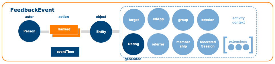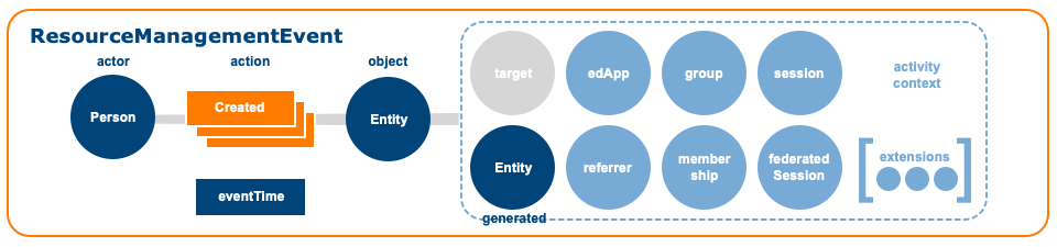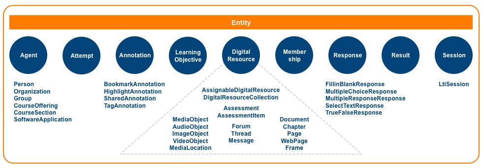 Entity: an object or a thing that participates in learning-related activity. Caliper Entity types provide coarsed-grained representations of applications, people, groups and resources that constitute the "stuff" of a Caliper Event. Each Entity corresponds to a node in a directed graph.