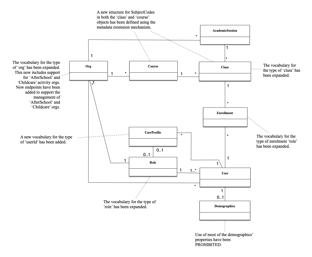 | 4. The Constraints and Extensions Applied by the Profile | The functional details for the profile. This includes definition of the data model extensions and increased constraints, the new endpoints to the existing Rostering Service, the definition of the new Student Absence Service, and the definition of the new vocabularies. |