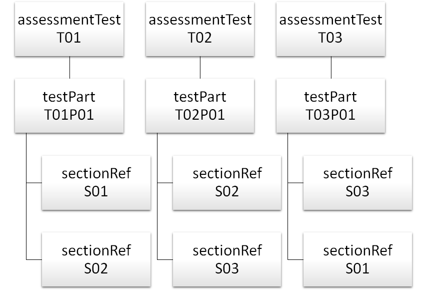The test structures may include further information about the structure of test, including the order of possible parts, sections, and items, or even adaptive testing information, as well as outcomes processing information. The test structure may also include instructions or information which is intended to be delivered to the candidate. All tests must contain at least one test part, and all parts must contain at least one section. Sections can contain further sections, which is referred to as "nested sections" in QTI. Adaptive testing includes staged adaptive by using preconditions and branch-rules or by using an external (IRT-based) adaptive algorithm (newly introduced in QTI 3). See Section 4 for more information on the Test structure. See Section 4.3 and 4.4 for more specifics around test parts and sections.
