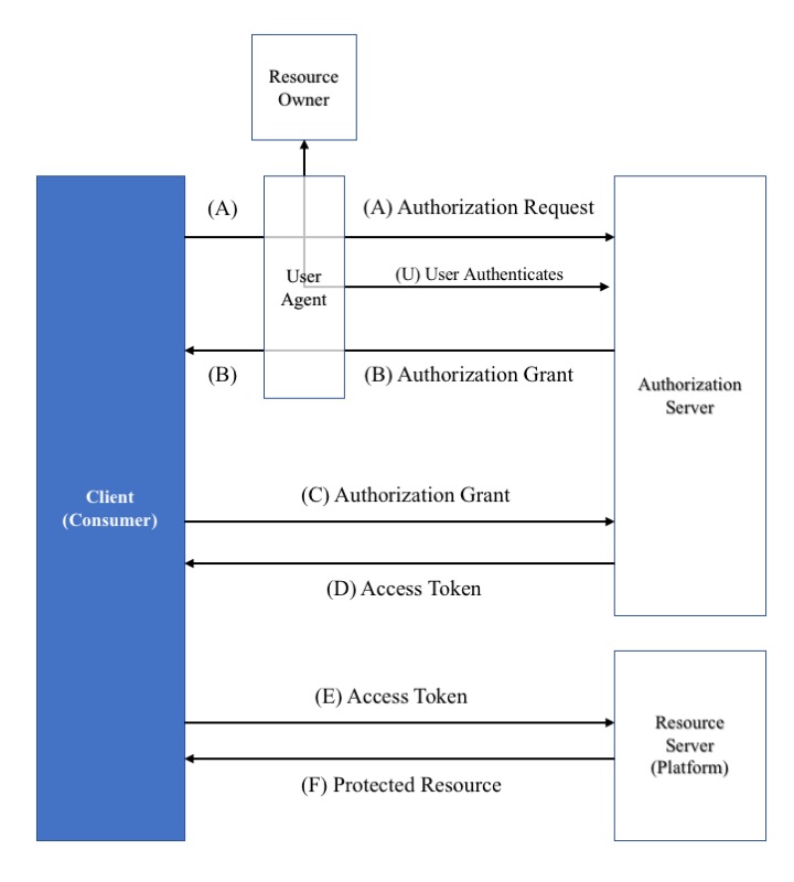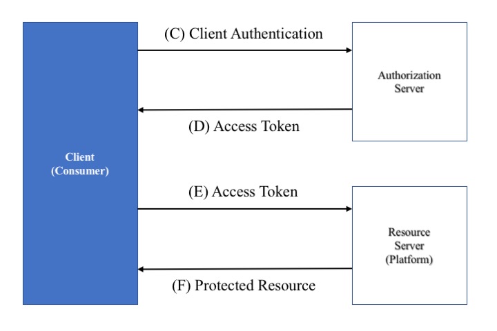 Note that the term "Client" is used as defined by OAuth 2.0. Therefore, communication being secured is between a Platform and a Consumer. Depending on the specific exchange choreography either of these could be the Client. From the perspective of a service either the Platform or the Consumer could initiate the communication exchange.