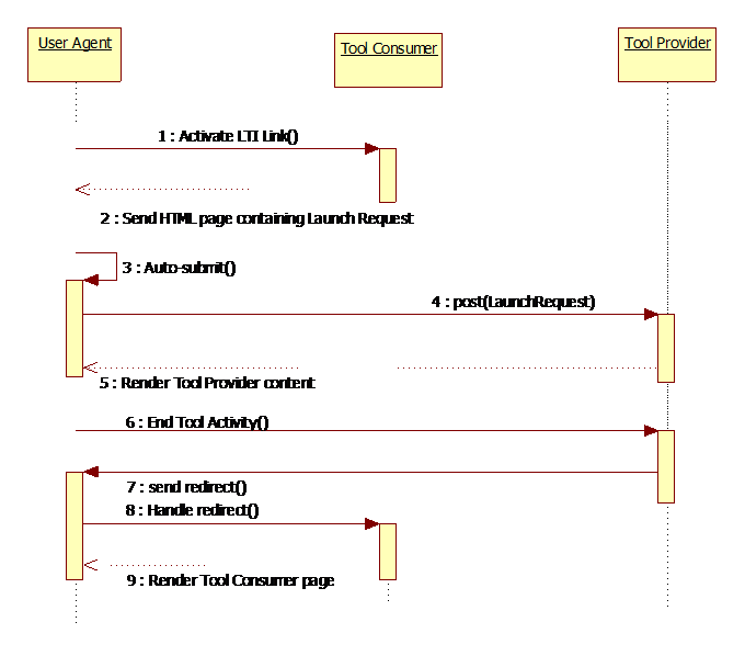 1. Activate LTI Link. The user clicks a link rendered in their browser by the Tool Consumer and the HTTP request is sent to the Tool Launch Service within the Tool Consumer. 2. Send HTML page containing Launch Request. The Tool Launch Service generates an HTML page containing a form whose ‘method’ attribute is ‘POST’. The form fields correspond to a serialization of the LTI Launch Request message. 3. Auto-submit: The HTML page includes JavaScript code to automatically submit the form. The target for the form should be the URL for the appropriate Message Handler in the Tool Provider system as defined in the Tool Profile (where the URL is constructed by combining the base URL and message “path”). 4. Post the Launch Request. The user’s browser posts the form containing the Launch Request to the Tool Provider server. 5. Render Tool Provider Content. The Tool Provider validates the launch request in accordance with the security profile negotiated during the tool deployment process. Among other things, the launch request includes a “return URL” parameter. The Tool Provider saves this URL (possibly as a cookie), so that it will be able to redirect the user’s browser back to the Tool Consumer system when the user is done interacting with the Tool. (See Step 7.) Finally, the Tool Provider responds to the launch request by sending the requested content to the user’s browser. 6. End Tool Activity. The user interacts with the Tool, and eventually performs some action to “close” the Tool. 7. Send Redirect. When the Tool Provider receives a request to close the Tool, it redirects the User’s browser to the “return URL” that it received when the Tool was launched at Step 4. The HTTP 301 redirect message should be sent to the same window or frame in which the Tool was launched. 8. Handle Redirect. The Tool Consumer receives the redirected request. 9. Render Tool Consumer page. The Tool Consumer resumes control of the user experience. |