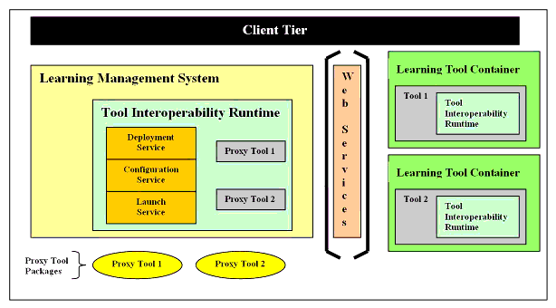 - Proxy Tool - as its name indicates, a Proxy Tool is a proxy or a facade in the LMS, for its associated real Tool. The architecture defines a standard mechanism for packaging a Proxy Tool for deployment to an LMS;