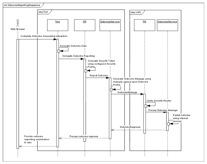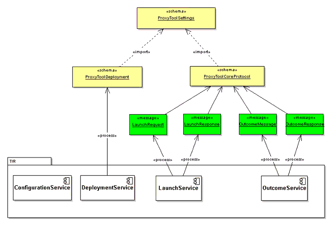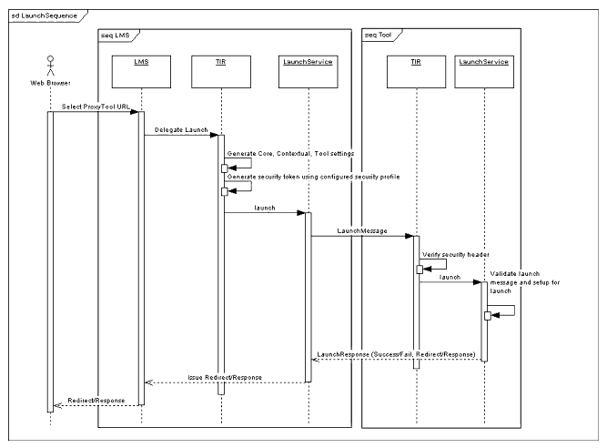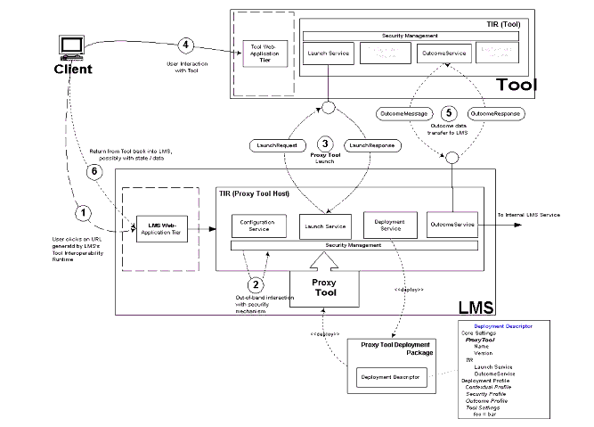 - Tools Interoperability Runtime (TIR) - the TIR is a collection of services implemented by any container (the LMS and Tool containers in this case) that will allow Proxy Tools to be deployed, configured, and launched from within that container. Thus, the TIR will include distinct services for managing the deployment, configuration, and launch of Proxy Tools from within or into the host environment, as well as services for receiving an outcome for the interaction.