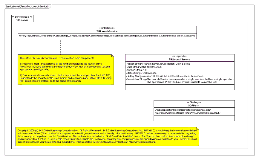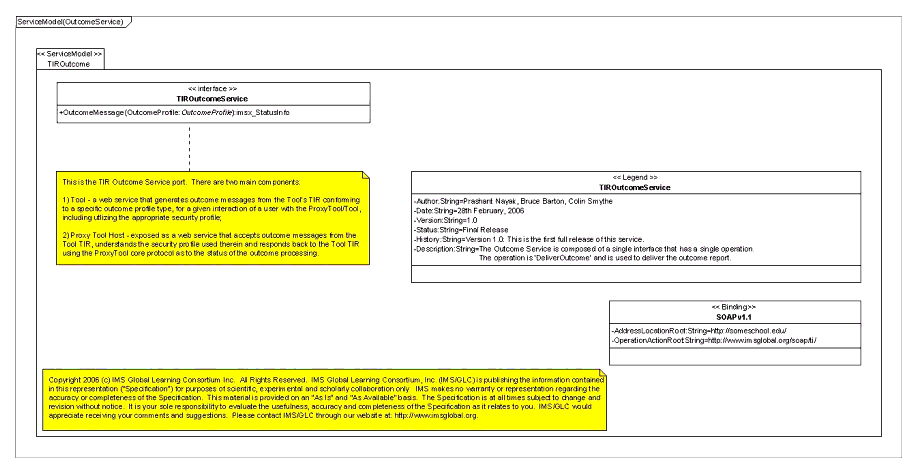 Whilst working on this approach in the 1EdTech Consortium, the participants also implemented a demonstrator for alt-i-lab 2005. Their implementations made use of the Web Services Description Language (WSDL) auto-generation tool developed by the 1EdTech General Web Services project group. The use of this tool has allowed the TI approach to be specified using the Unified Modelling Language (UML), from which the tool produces a WSDL file that can be used with a variety of Web Services development environments. The fact that there exist working systems that have been publicly demonstrated prior to the release of this document will hopefully instill confidence in the approach for other adopters and implementers.