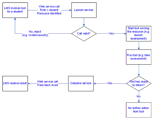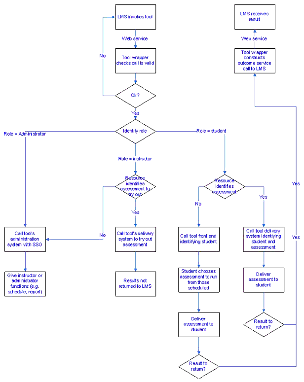 The diagram in Figure 5.2 below shows a more complex possible tool set of interactions, where depending on the role and resource passed through from the LMS, different parts of the tool can be invoked. The diagram assumes an assessment management system.