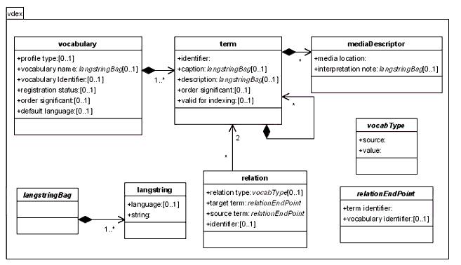 - Allow VDEX to provide a common grammar for several classes of vocabulary, each of which shares a great deal of information concepts but each of which has specific requirements. The alternative approaches of creating small models for each class or modularizing VDEX to a finer granularity are felt to be less maintainable, less intelligible and probably less interoperable than the proposed approach.