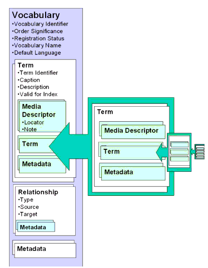 - Meta-data: Optional meta-data records that further describe the vocabulary. This is for convenience in cases where it is desirable to closely associate meta-data with the data it describes. More than one meta-data element may be used but each should only contain one meta-data record.